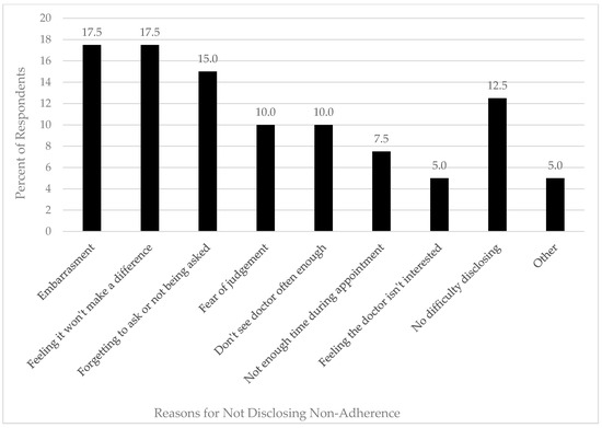 Sixty respondents (24.7%) reported they would not disclose non-adherence to their eye care provider. Of these respondents, 40 (66.4%) reported reasons for not disclosing non-adherence (Figure 4). Reasons included embarrassment about missing drops (17.5%), with two respondents disclosing embarrassment about being unable to afford the drops; 17.5% indicated feeling that disclosing non-adherence “would not make a difference”; 15.0% reported forgetting to mention it or not being asked about adherence by the eye care provider; 10.0% reported a fear of judgment by the eye care provider; 10.0% felt they did not see their eye care provider often enough to discuss adherence; 7.5% stated not having enough time during appointments to discuss the subject of adherence; and 5.0% felt that the eye care provider was not interested in hearing about it. One respondent specifically reported not attending follow-up appointments with the eye doctor due to the associated cost.