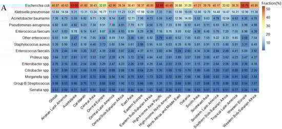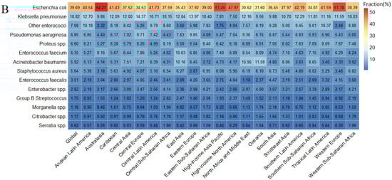 Fraction of deaths attributable to (A) and associated with (B) bacterial AMR among 21 GBD regions and 14 pathogens, 2019. AMR = antimicrobial resistance. GBD = Global Burden of Diseases, Injuries, and Risk Factors Study.