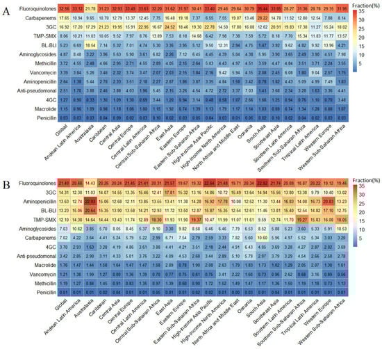 Fractions of deaths attributable to (A) and associated with (B) bacterial AMR among 21 GBD regions and 13 antibiotic classes, 2019. 3GC = third-generation cephalosporins. 4GC = fourth-generation cephalosporins. Anti-pseudomonal = anti-pseudomonal penicillin or beta-lactamase inhibitors. BL-BLI = β-lactam or β-lactamase inhibitors. Resistance to 1+ = resistance to one or more drugs. TMP-SMX = trimethoprim/sulfamethoxazole. AMR = antimicrobial resistance. GBD = Global Burden of Diseases, Injuries, and Risk Factors Study.