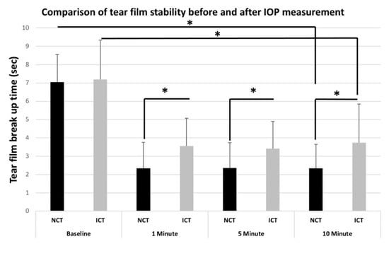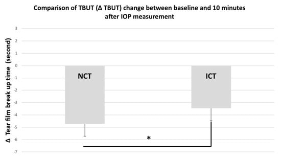 The mean change in TBUT from baseline to 10 min after tonometry (ΔTBUT) was significantly lesser for ICT measurements compared with NCT measurements (p < 0.05). * represents p < 0.05.