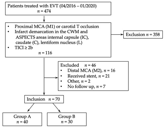 Angiographic outcome was defined by the degree of revascularization at the end of the endovascular procedure using the modified Thrombolysis in Cerebral Infarction (mTICI) score [16]. Patients with atherothrombotic or distal M2 occlusions were excluded, as well as patients with an unsuccessful thrombectomy maneuver (mTICI 0-2a). For an overview, see Figure 1 (consort diagram).