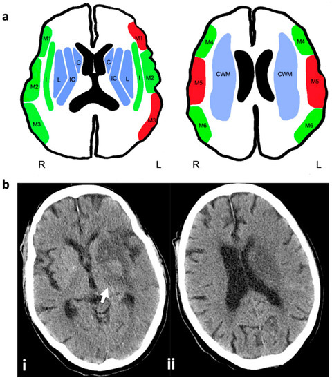 - Barber, P.A.; Demchuk, A.M.; Zhang, J.; Buchan, A.M. Validity and Reliability of a Quantitative Computed Tomography Score in Predicting Outcome of Hyperacute Stroke before Thrombolytic Therapy. ASPECTS Study Group. Alberta Stroke Programme Early CT Score. Lancet 2000, 355, 1670–1674. [Google Scholar] [CrossRef]