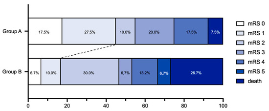 The modified Rankin Scale (mRS) score at 90 days demonstrates a shift toward excellent outcome (mRS 0–1) for patients in group A (n = 40) as compared with group B (n = 30).