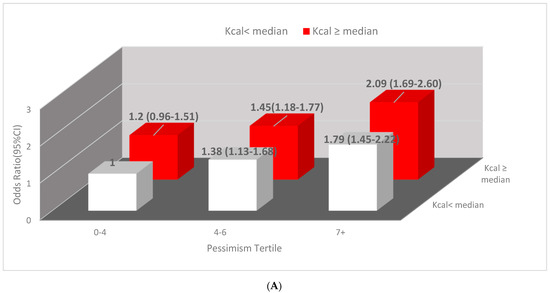 In the multivariable model, we assessed the joint impact of pessimism and calorie intake on insomnia and the joint impacts of pessimism and dietary acid load using PRAL. The results are displayed in Figure 1. As shown in Figure 1A, women within the highest tertile of pessimism and calorie intakes higher than the median (≥1603 Kcal) had two times the odds of insomnia compared to women within the lowest tertile and calorie intake lower than the median (OR = 2.09; 95% CI, 1.68–2.60). Figure 1B displays the joint association of pessimism and PRAL with insomnia. Women whose PRAL was at or above the median and in the highest tertile of pessimism score almost had two times the odds of insomnia, OR = 1.98,95% CI(1.60–2.46), compared to women within the lowest pessimism tertile and PRAL below the median.