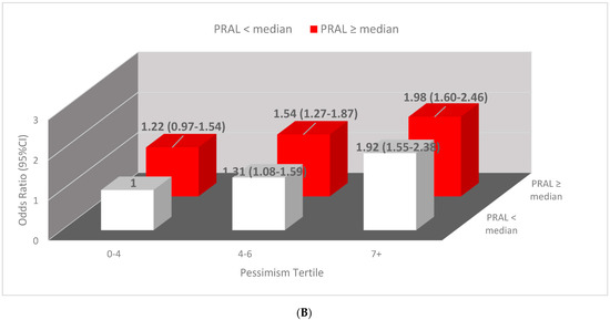 (A) Joint association of calorie intake and pessimism with insomnia. Covariates in the multivariable-adjusted model include caffeine quartile, BMI, age, smoking status, status of estrogen receptor and progesterone receptor, baseline co-morbidities, menopausal status, and education. (B) Joint association of PRAL and pessimism with insomnia. Covariates in the multivariable-adjusted model include caffeine quartile, BMI, age, smoking pack and years, estrogen receptor and progesterone receptor, co-morbidities, menopausal status, and education. Abbreviations: PRAL potential renal acid load.