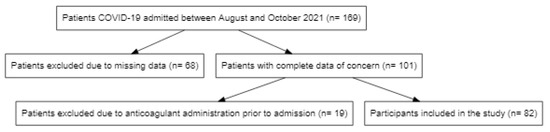 Out of a total of 169 COVID-19 patients admitted between August and October 2021 at the Clinical Municipal Emergency Hospital Timisoara, 82 were included in the analysis and were followed up during hospitalization (Figure 1).