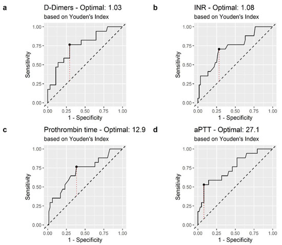 Receiver operating characteristic (ROC) curve of coagulation biomarkers in the prediction of in-hospital mortality: (a) D-Dimer; (b) International Normalized Ratio (INR); (c) Prothrombin Time (PT) (d) Activated Partial Thromboplastin Time (aPTT). The dashed red line represents the Youden index.
