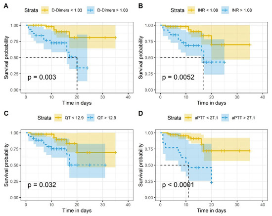 Figure 3 illustrates the Kaplan–Meier survival curve plotted in terms of the cut-off values of D-Dimer, INR, PT and aPTT. Differences in the survival of patients with coagulation biomarker levels above cut-off values in comparison to subjects with levels lower than cut-off values were statistically significant (Figure 3). The survival distributions for coagulation biomarker values above or below the set cut-off values were statistically significantly different: χ2 = 8.8 (p = 0.003) for D-dimer, χ2 = 7.8 (p = 0.005) for INR, χ2 = 4.6 (p = 0.03) for PT, and χ2 = 16.6 (p < 0.0001) for aPTT, respectively.