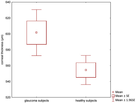 Corneal thickness for glaucoma vs. healthy subjects in the form of box plots.