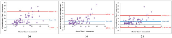 Difference between the measurement with iCare and Perkins in the form of Bland–Altman plot at the different time points for all children (a) T1, (b) T2, (c) T3. Abbreviation: IC: iCare; P: Perkins.