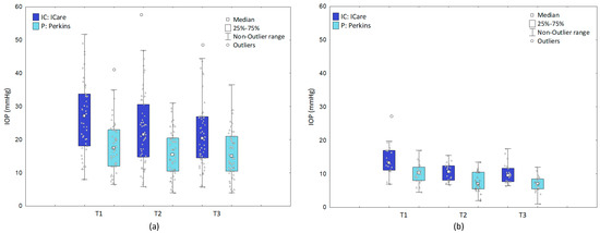 For healthy subjects, the median IOP measured with iCare was statistically higher than measured with Perkins (p < 0.001). The median IOP for iCare at T1 was: 13.3 (11.1–17.0), T2: 10.6 (8.1–12.4), T3: 9.6 mmHg (7.7–11.7) and for Perkins at T1: 10.3 (8.0–12.0), T2: 7.0 (5.5–10.5), and T3: 7.0 mmHg (5.5–8.5) (median ± IQR). In addition, it was shown that IOP values in the iCare measurement decreased significantly over time between T1 and T2 (p < 0.001) and T1 and T3 (p < 0.001) was not changed between T2 and T3—median IOP at T1 > T2 (p < 0.001), T2 = T3 (p = 0.101), and T1 > T3 (p < 0.001). With Perkins, IOP values fell between T1 and T2 (p < 0.001) and T1 and T3 (p < 0.001). The IOP did not change significantly between points T2 and T3—median IOP at T1 >T2 (p < 0.001), T2 = T3 (p = 0.015), and T1 > T3 (p < 0.001), see Figure 4b. The IOP reduction between T1 and T2 was 20% for iCare and 32% for Perkins.