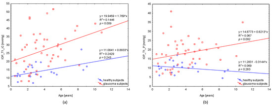 Correlation of age and IOP for (a) iCare and (b) Perkins at T1. Abbreviation: IOP: intraocular pressure; IC: iCare; P: Perkins; y: function; x: age; R2: regression squared error metric; p: p-Value.