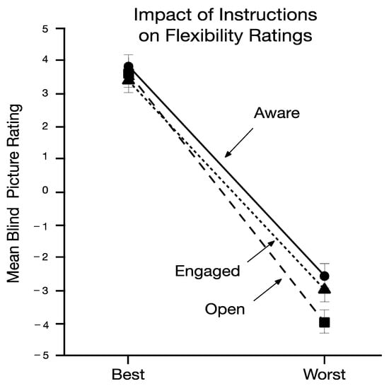 Cronbach’s alpha was then examined across the three ratings of elements of psychological flexibility for the 164 whole-body photos to assess whether they reflected a common core concept. Cronbach’s alpha was 0.965, above the cutoff of 0.95 suggested even for highly refined scales []. This indicates that the three scores (open, aware, and engaged) could indeed be treated as a composite. These scores were thus calculated for each photo, based on a simple average of the three ratings. Like the three ratings themselves, composite scores could, in principle, vary from −10 to 10; in this study, the actual range across all whole-body photos was −8.92 to 8.15 (Mean = 0.24; SD = 5.06).