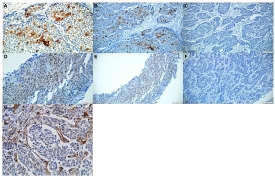 Immunohistochemical evaluation was conducted by a senior pathologist in a blinded manner for patients’ characteristics and outcomes. For L1CAM, the percentage of tumor cells with partial or complete membranous staining was estimated, and cases with more than 5% of membrane-positive tumor cells were considered positive (Figure 1A,B) [27]. For YAP/TAZ, the percentage of tumor cells with nuclear staining was estimated, and cases with more than 5% positive tumor nuclei were considered positive (Figure 1D,E) [28]. For β1-integrin, we estimated the staining intensity of endothelial cells as none, mild, moderate, and severe in both the tumor tissue and normal liver tissue distant from the tumor. If endothelial cells of the tumor tissues were more strongly stained than endothelial cells of normal liver tissues, the case was classified as positive (Figure 1G).
