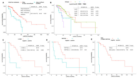 Survival outcome in total patients. (A) LMOS according to initial radiologic pattern of liver metastasis; (B) LMOS according to molecular subtypes; (C) LMOS according to L1CAM expression; (D) LMOS according to YAP/TAZ expression; (E) LMOS according to positive expression for both L1CAM and YAP/TAZ. LMOS—liver metastasis-associated overall survival; HR—hazard ratio; CI—confidence interval; L1CAM—L1 adhesion molecule; YAP/TAZ—Yes-associated protein 1/Transcriptional co-activator with PDZ-binding motif.