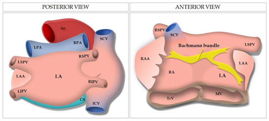 The LA is a thin-walled structure located in the inflow path from the pulmonary veins (PVs) to the left ventricle (LV) and is characterized by a main body and a finger-like trabeculated appendage [13]. Left atrial appendage (LAA) is the only remnant of the original embryonic LA, whereas the main smooth-walled left atrial body develops later from the outgrowth of the PVs [14]. The LA posterior wall is the anatomical location of the venous component and contains the inflow of the four PVs (Figure 1). The myoarchitecture of the LA is highly complex and with great variability between individuals, with overlapping and differently oriented myofibers that are not divided into layers by sheaths or fibrous laminae [15,16]. Nevertheless, some structural muscular components are regularly constant, such as Bachmann’s bundle, the most superficial group of myofibers which run along the LA anterior wall parallel to the atrioventricular groove [13].