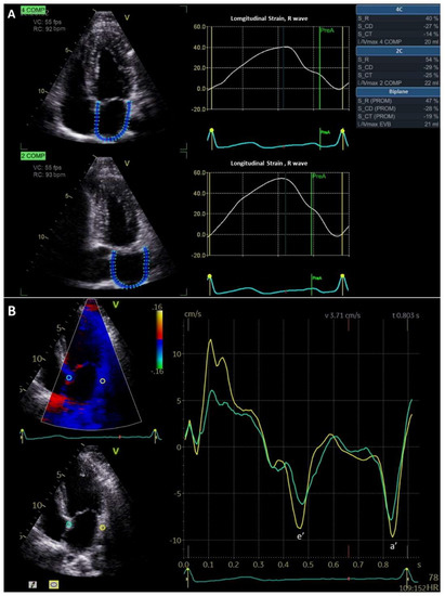- Nagueh, S.F.; Smiseth, O.A.; Appleton, C.P.; Byrd, B.F.; Dokainish, H.; Edvardsen, T.; Flachskampf, F.A.; Gillebert, T.C.; Klein, A.L.; Lancellotti, P.; et al. Recommendations for the Evaluation of Left Ventricular Diastolic Function by Echocardiography: An Update from the American Society of Echocardiography and the European Association of Cardiovascular Imaging. J. Am. Soc. Echocardiogr. 2016, 29, 277–314. [Google Scholar] [CrossRef] [Green Version]