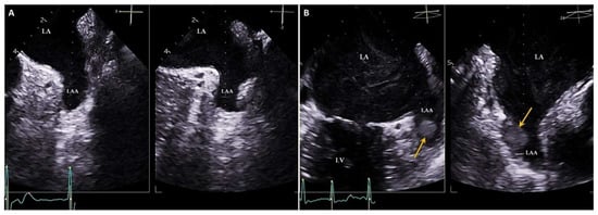 Analysis of LAA prior to electrical cardioversion with 2D TEE multiplane mid-esophageal view to assess the stroke risk. LAA without thrombus (A) and with thrombus inside (yellow arrows; (B)). LAA: Left atrial appendage; LA: Left atrium.