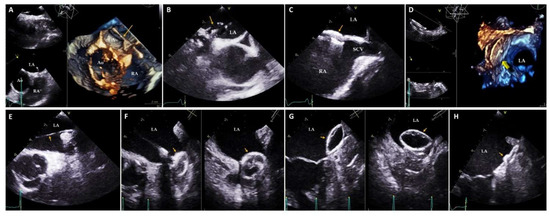 TEE is usually performed to study some morphological characteristics of the LA. The main indications of the technique are the assessment of intra-atrial thrombosis (especially in the LAA; Figure 5), the evaluation of the mitral valve and in the performance of structural interventions, particularly in the hemodynamics laboratory, where LA is the treatment target (closure of the LAA, patent foramen ovale, etc.) or a step for treatment (mitraclip, periprosthetic leak treatment, etc.) (Figure 6) [37,38,39,40]. In the field of structural heart interventions, TEE has become the technique of choice during treatment to help guide those procedures that involve the LA in the performance of disease management [38]. Furthermore, TEE has demonstrated good correlation with TTE in the evaluation of atrial function and size, although it usually slightly underestimated the parameters in relation to the cavity size [11,41]. Nevertheless, because the probe is very close to the LA, in many cases, it is difficult to obtain the entire cavity in one plane, which does not allow for an overall assessment.