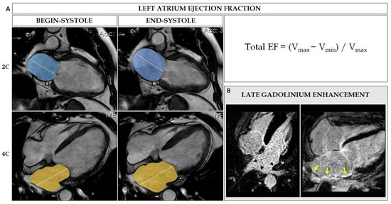CMR sequences for LA evaluation. (A) LA volume and ejection fraction assessment, using two-chamber and four-chamber views, with areas and lengths planimetered (including the formula for the calculation of total ejection fraction). (B) Late gadolinium enhancement sequence to identify fibrosis around the PVs and in the LA wall prior pulmonary ablation procedure. (Left Panel) Arrowheads demonstrate absence of fibrosis in the atrial wall. (Right Panel) Yellow arrows indicate presence of fibrosis in the atrial wall.