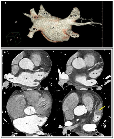 MDCT images focusing on the LA and the anatomical relationships. (A) Volume-rendered image showing LA and PVs prior to the performance of PV ablation in AF. (B,C) Axial MDCT images depicting LA and LAA prior to its closure. Yellow arrow in (C) shows presence of LAA thrombus. LA: left atrium; LAA: left atrial appendage; LIPV: left inferior pulmonary vein; LSPV: left superior pulmonary vein; RIPV: right inferior pulmonary vein; RSPV: right superior pulmonary vein.