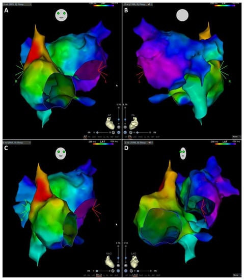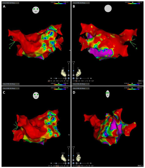 Figure 11. Substrate voltage map of LA in a patient with AF. Substrate voltage map of bipolar electrograms in the LA, performed in a patient with AF. The zones with voltage >0.5 mV identify normal tissue and are shown in purple and the red zone denotes voltage <0.1 mV and identify endocardial scar. Green, yellow, and blue represent intermediate voltages. Three-dimensional (3D) position coordinates were recorded with CARTO 3 (Biosense Webster, Diamond Bar, CA, USA) and a 20-pole circular mapping catheter. Peak-to-peak voltages were collected from the 10 dipoles and a high-density bipolar voltage map was created. Left atrial voltage and activation maps were constructed during SR before ablation. (A,B): 2 images of the same map are shown in anteroposterior (AP) posterior anterior (PA) projections, respectively. (C,D): 2 images of the same map are shown in right anterior oblique (RAO) and left anterior oblique (LAO) projections, respectively.