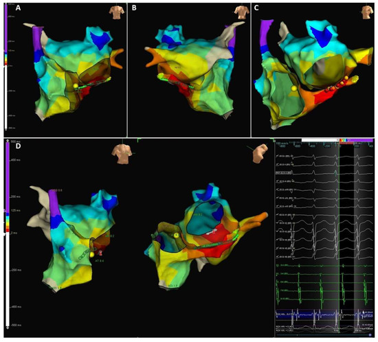 Figure 10. Supraventricular tachycardia due to left accessory pathway activation map. Electroanatomic map of activation times of the right and the LA, performed during supraventricular tachycardia due to concealed accessory left pathway. The atrial anatomy was determined by the impedance catheter localization system integrated into the NAVEx system. Activation sequence was derived from semi-automated sequential analysis of local electrograms. Activation times are color-coded with red indicating sites with earliest activation and purple sites with latest activations. (A–C): 3 images of the same map are shown in anteroposterior (AP) posterior anterior (PA) and caudal left anterior oblique (LAO) projections, respectively. (D): 2 images of the same map are shown in right anterior oblique (RAO) and caudal projections, respectively. The earliest site is the posterolateral part of mitral valve. - Voltage maps or Substrate maps display color-coded voltage values for each collected location. The voltage is the difference in millivolts between the components of the detected activation complex on the roving waveform (Figure 11). Transition from paroxysmal to non-paroxysmal AF is often characterized by advancing atrial structural remodeling or worsening of atrial cardiomyopathy. During AF, the atria undergo electrophysiological and structural changes which promote the progression of AF. Among these changes, the accumulation of fibrosis is a key factor in determining a patient’s susceptibility to arrhythmias [9].