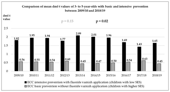 - While a relatively constant and low mean dmf–t value was found when comparing the representative long-term data on the caries experience of 3–5-year-old kindergarten children with basic prophylaxis measures, a significant decline in caries was seen in the kindergarten children from socially deprived areas. This decline in caries may possibly be attributed to regular fluoride varnish applications, where children at the age of five received up to six fluoride varnish applications. The gap between children with and without fluoride varnish application in kindergartens has narrowed slightly over 10 years. Therefore, the null hypothesis—there is no difference between the two groups in regards to long-term caries experience (2009–2019)—must be rejected.