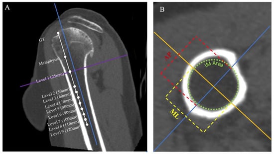 Two-dimensional-CT radiographic views depicting the process of measurement technique. Frontal view (A) of segmented humerus demonstrates measurements: greater tuberosity (GT) to metaphysis, Level 1—metaphysis, Level 2—25 mm distal to the metaphysis, Level 3—50 mm distal to the metaphysis, and then succeeding levels of 10 mm segments up to 120 mm distal to the metaphysis. The ML line (purple solid) depicts the cross section where measurements will be taken from the axial view and the PD line (blue solid) formatted to bisect the intramedullary (IM) canal. The axial view (B) depicts example measurements from the respective 25 mm segment from the axial view; ML axis (orange solid), AP axis (blue solid), ML (yellow dotted), AP (red dotted), and IM area (inside green dotted).