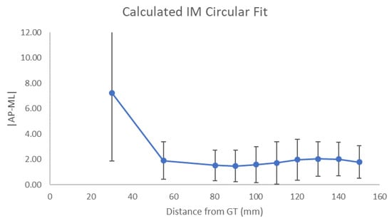 Calculated intramedullary (IM) canal closest fit to a perfect circle. Mean of absolute values (±standard deviation) of the difference between medial-lateral (ML) and anterior-posterior (AP) measurements taken at each level where the value of 0 represents a perfect circle. GT, greater tuberosity; mm, millimeters.