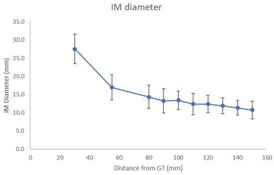 Intramedullary (IM) canal diameter. Mean values (±standard deviation) of diameter calculated from the area of best fit circles taken at each level. GT, greater tuberosity; mm, millimeters.
