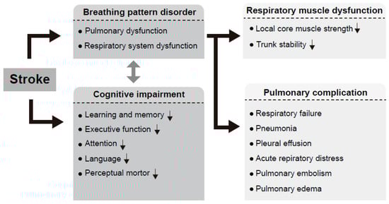 Furthermore, the specific mechanism by which enhanced breathing improves cognitive function in patients with stroke is yet to be elucidated. However, the positive effects of breathing exercises on cognitive functional improvement have been reported in studies although not on patients with stroke. Multiple studies on healthy adults have reported a positive effect of breathing exercises on cognitive functional improvement [33,34,35]. Considering the synchronization of natural breathing and neuronal activity, breathing activates the cortex, hippocampus, and amygdala that are related to memory performance [36]. Abnormal breathing, such as mouth breathing in children, has been reported to reduce academic achievement and memory [37]. These studies suggest an association between normal breathing and cognitive function. Another study on patients with stroke indicated a potential interaction between breathing and cognitive function—walking activated the cortex to increase the respiratory demand, and thus, walking ability was reduced upon engagement of the respiratory cortex [38]. Therefore, it is necessary to investigate the influence of respiratory function and breathing exercises on cognitive function in patients with stroke. Herein, we review previous studies on the factors related to cognitive function in patients with stroke and the association between those factors and breathing (Figure 1).
