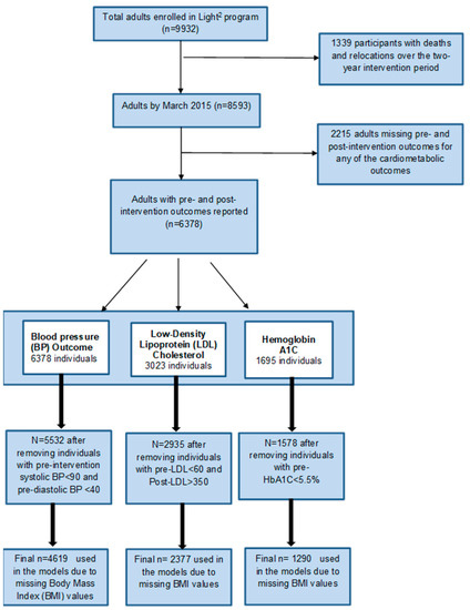 We extracted HbA1C, BP, and LDL-cholesterol levels before and after the LIGHT2 program. The recruitment was complete, and the care coordination documentation system was implemented on 1 July 2013. We used measures reported within 6 months before that date or before the first nurse care manager contact within the first 3 months of the intervention as the pre-intervention values. For post-intervention measures, we used the values reported within 6 months after the intervention completion date. If there were no values reported in the 6 months after the completion of the intervention, we used the last reported value within the last 3 months of the intervention. We used the average of the last two reported B.P. readings if there were multiple readings in the defined pre-intervention and post-intervention time-period. Individuals with very low pre-intervention values were not included in the analyses. More specifically, if pre-intervention LDL < 60 mg/dL, pre-intervention HbA1C < 5.5%, pre-intervention diastolic B.P. < 40 mm of Hg, and pre-intervention systolic B.P. < 90 mm of Hg, individuals were excluded from the respective analysis. We also excluded individuals with two extremely high values (above 350) of post-intervention LDL cholesterol from the analysis for LDL-cholesterol outcomes. The population was comprised of 6378 individuals after exclusions.