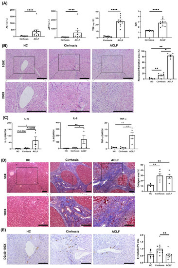 ACLF patients exhibited more severe liver damage and inflammation and fewer LVs than cirrhosis patients. (A) The plasma level of ALT, AST, TBil, and INR of enrolled 25 patients. (B) H&E staining of liver tissue among HCs, cirrhosis patients, and ACLF patients. (C) The mRNA expression of proinflammatory cytokines (IL-1β, IL-6, and TNF-α) in the liver of ACLF compared to that in cirrhosis and HC group by qRT-PCR. (D) Masson staining of liver tissues among HCs, cirrhosis patients, and ACLF patients. (E) Representative IHC images of LVs (D2/40) in the liver among HCs, cirrhosis patients, and ACLF patients (100× field) (* p < 0.05, ** p < 0.01, **** p < 0.0001; bar = 200 μm).