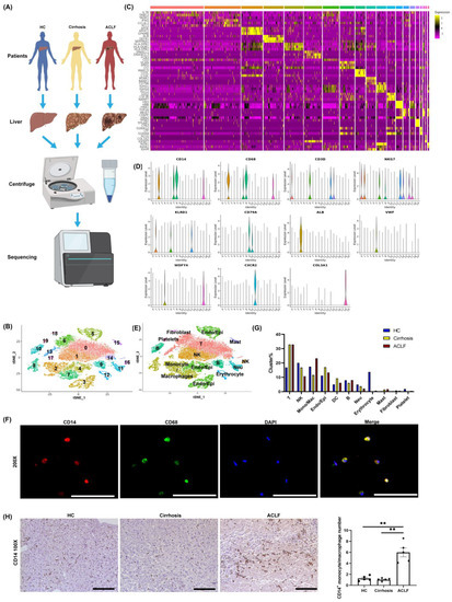 scRNA-seq revealed that a large number of monocyte/macrophages infiltrated into ACLF liver. (A) The workflow of scRNA-seq analyses. NPCs isolated from 5 ACLF livers, 3 cirrhosis livers, and 2 HC livers were included in this study. (B) 26,200 cells from HC (n = 2), cirrhosis (n = 3), and ACLF (n = 5) human livers were divided into 20 clusters (0–19), shown by tSNE plotting. (C) The representative marker genes of 20 subpopulations are presented with a heat map. Each column represents a different cell cluster and is arranged in the order of 0–19. (D) The classical marker genes of each cluster: CD14 and CD68 for monocyte/macrophages, CD3D for T cells, CD79A for B cells, NKG7 and KLRD1 for NK cells and T cells, ALB and VWF for epithelial tissue cells (including epithelial cell and endothelial cells), CXCR2 for neutrophils, WDFY4 for dendritic cells, COL3A1 for fibroblasts. (E) We re-annotated the 20 subpopulations according to their marker genes, and 11 classical clusters were annotated to facilitate the next analyses. (F) Cell immunofluorescence of CD14 and CD68 in isolated monocyte/macrophages from ACLF liver (200× field). (G) The proportion of 11 classical clusters among HCs, cirrhosis patients, and ACLF patients. (H) IHC staining for monocyte/macrophages (CD14) in the liver of HCs, cirrhosis patients, and ACLF patients (100× field). (** p < 0.01; bar = 200 μm).