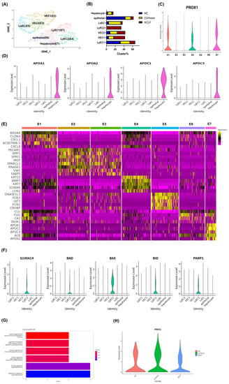 PROX1 was a typical marker and functional gene for LyECs, but also expressed in hepatocytes [10,34,35,36,37,38]. In our study, E1, E4, and E7 clusters specifically expressed PROX1 (Figure 3C). To distinguish these three clusters, we enriched the highly expressed genes of each cluster by KEGG analyses to describe the functional characteristics of each cluster. As shown in Figure S3, the E7 cluster showed the characteristics of hepatocytes with the expression of a series of metabolic-related pathways, and the violin plotting showed that the E7 cluster highly expressed APOA1, APOA2, APOC1, and APOC3 (Figure 3D), which indicated that the E7 cluster was a hepatocyte population.