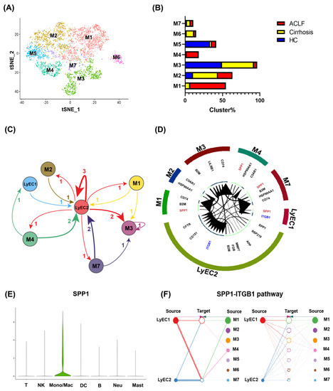 Infiltrating monocyte/macrophages secreted SPP1 to induce apoptosis and dysfunction of LyECs in the liver of ACLF patients. (A) 4738 monocyte/macrophages from HCs (n = 2), cirrhosis patients (n = 3), and ACLF patients (n = 5) were divided into 7 clusters (M1-M7). (B) The proportion of 7 monocyte/macrophage clusters. (C) Receptor/ligand analyses of LyECs and monocyte/macrophages. The number on the middle arrow represents the number of highly expressed (>50%) receptors and ligands that could be paired. (D) The key receptor/ligand for LyECs and monocyte/macrophages. The larger the area of the arrow, the higher the expression level of the receptor/ligand on this subpopulation. (E) SPP1 mainly originated from intrahepatic monocyte/macrophages. (F) M1 and M4 clusters in ACLF were the main origin of SPP1. The thicker the line, the more SPP1 secreted.