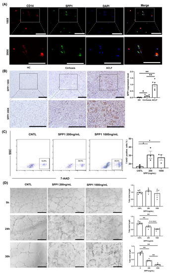 SPP1 secreted by infiltrating monocyte/macrophages induced LyEC death and impaired the ability of tube formation of LyECs in vitro. (A) Cell immunofluorescence of CD14 and SPP1 in isolated monocyte/macrophages from ACLF liver (100× and 200× field). (B) Representative IHC images of SPP1 in liver tissues among HCs, cirrhosis patients, and ACLF patients (100× and 200× field). (C) Flow cytometry showed a higher proportion of 7-AAD-positive LyECs after SPP1 treatment (200 ng/mL and 1000 ng/mL). (D) The tube formation assays of LyECs for CNTL and SPP1 treatment (200 ng/mL and 1000 ng/mL) (100× field). (* p < 0.05, ** p < 0.01; bar = 200 μm).