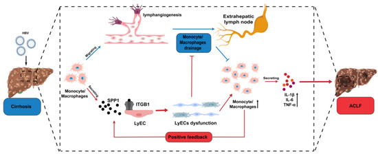 The innate immune system plays a major contributory role in ACLF development. Activated Kupffer cells (KCs) secrete pro-inflammatory cytokines (e.g., tumor necrosis factor (TNF)-α, interleukin (IL)-1β, and IL-6), chemokines, and reactive oxygen species (ROS) that amplify the pro-inflammatory signal and increase infiltration of immune cells (mainly macrophages and neutrophils) into the liver, further contributing to the inflammatory process [15,16]. Among the various immune cells, macrophages interact most with LVs [10]. LyECs secrete chemotactic factors to attract macrophages [17]. In turn, macrophages secrete lymphangiogenic cytokines such as vascular endothelial growth factor (VEGF)-C, VEGF-D, and VEGF-A to promote inflammation-induced lymphangiogenesis [18]. It has been postulated that patients with ACLF display evidence of a pro-inflammatory state, with local hepatic inflammation and vascular endothelial dysfunction that accelerates progression to multiple organ failure [19]. Therefore, new therapeutic approaches to reduce intrahepatic infiltration of macrophages may reduce the incidence and mortality of ACLF. In-depth exploration of the relationship between intrahepatic LVs and infiltrating macrophages could provide a solid theoretical foundation.