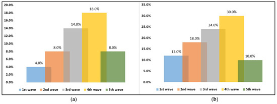 | 1st Wave (n = 50) | 2nd Wave (n = 50) | 3rd Wave (n = 50) | 4th Wave (n = 50) | 5th Wave (n = 50) | p-Value * | |