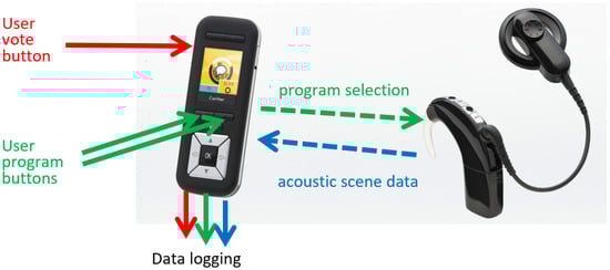 The CR230 remote-control device allowed subjects control over sound processor volume and sensitivity, as is typical for daily use (Figure 1). It also displayed the current listening environment class [32]. A large side button (conventionally used to enable the telecoil feature) was repurposed and used as a vote button. The data logging capability of the CR230 allowed the listening environment (Quiet, Speech, Speech in Noise, Noise, Wind, and Music) and listening program to be recorded as the user pressed the vote button. These features provided a suitable platform to capture EMA data. In this study, we investigated a sound processing program preference through subject voting between a BEAM program and a ForwardFocus program in real-world environments. For analysis, the listening environments relevant for communication were used, which excluded the Wind and Music classes.