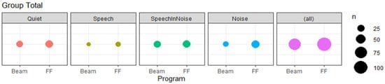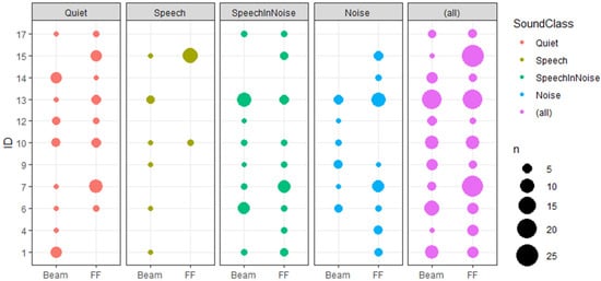 Program preference accumulated across entire subject group separated by sound class. Size of data point indicates number of votes. “BEAM” specifies the program consisting of the algorithms ADRO, SNR-NR, ASC and BEAM. “FF” indicates the second program containing the ForwardFocus microphone technology.