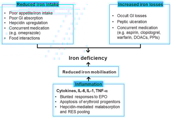 The aetiology of iron deficiency in HF is complex and multifactorial, with contradictory evidence on the precise cause(s) []. Factors that may contribute to iron deficiency include reduced appetite, co-administration of proton pump inhibitors, occult gastrointestinal blood loss and comorbidities such as chronic kidney disease and inflammatory activity [,,,]. The possible driving factors for iron deficiency in HF are summarised in Figure 2. Since hepcidin is tightly regulated by inflammatory activation as part of the antibacterial response mechanism and HF is a condition of increased inflammatory activation, patients with HF may have high levels of circulating hepcidin [,,,]. Hepcidin inhibits iron absorption by binding to ferroportin, causing sequestration of iron in the reticuloendothelial system and reducing the available useable iron []. There is some evidence that, as HF progresses and iron deficiency develops, the circulating hepcidin levels may become low in patients with CHF [,].