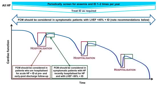 Screening and treatment of iron deficiency across the HFrEF continuum [,,]. Iron deficiency determined by a ferritin <100 μg/L or TSAT <20% when ferritin is 100–299 μg/L; and anaemia determined by a Hb <13 g/dL in males and <12 g/dL in females. TSAT = (serum iron concentration/total iron-binding capacity) × 100. FCM, ferric carboxymaltose; Hb, haemoglobin; HF, heart failure; HFrEF, heart failure with reduced ejection fraction; ID, iron deficiency; LVEF, left ventricular ejection fraction; TSAT, transferrin saturation.