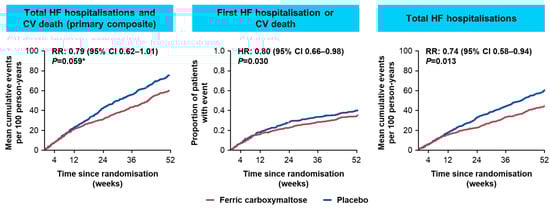 Although the initial randomised, placebo-controlled clinical trials established that IV FCM treatment improved symptoms, functional capacity and health-related QoL of HFrEF patients with iron deficiency, they were not planned or sufficiently powered to assess the treatment effects on hard outcomes, such as hospitalisations and mortality. However, meta-analyses of FCM vs. placebo randomised controlled trials of patients with CHF who have iron deficiency, including the CONFIRM-HF and FAIR-HF studies, indicated that IV FCM treatment reduced the risk of all-cause death or cardiovascular (CV) hospitalisation, CV death or HF hospitalisation, and all-cause/CV death or recurrent CV/HF hospitalisations as combined endpoints [,].