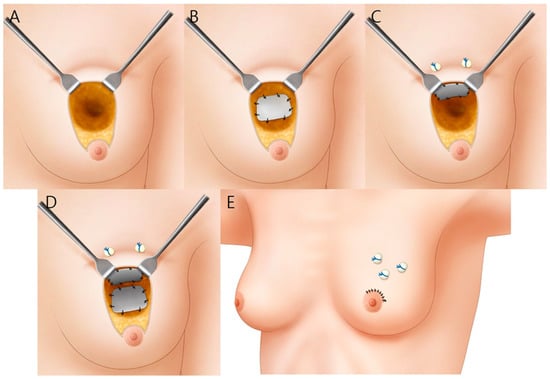 A schematic illustration summarizing the surgical procedure. (A) The glandular tissue is exposed after partial mastectomy; (B) An ADM is placed on the glandular flap and sutured; (C) An ADM is placed under the skin flap and fixed using the pullout suture technique with Prolene® 2-0 sutures and bolsters; (D) The ADM graft is performed in two layers; (E) The suture is completed.