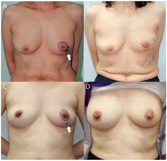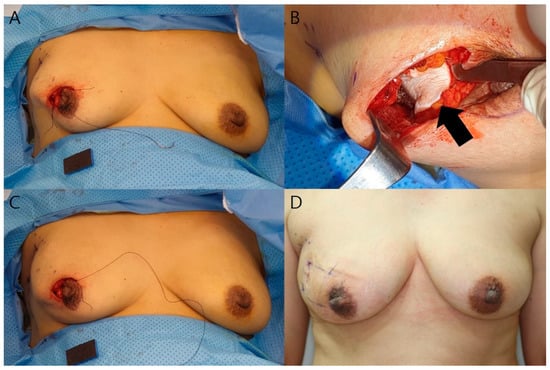 The breast surgeon made the initial incision on the outer circle, and partial mastectomy with sentinel lymph node biopsy was performed (Figure 1A). Following this, the plastic surgeon performed the reconstruction. A glandular advancement flap was elevated from the pectoralis muscle from both sides according to the tumor location to cover the defect. A Jackson–Pratt (JP) drain was inserted into the subglandular area. Once the glandular flaps were approximated with Vicryl® (Ethicon Inc., Somerville, NJ, USA) 1-0 sutures, IMF retraction or depression deformity might occur as the glandular flap was moved to the defect site (Figure 2A). When a deformity occurred, we removed the previous sutures, and then the flap was sutured in a different direction, and less approximated region and the area where the defect remained was covered with the ADM using Vicryl® 1-0 sutures (Figure 1B and Figure 2B). The patient was then seated to ascertain the degree of depression (Figure 2C). Next, if the volume was insufficient, an ADM graft was also performed under the skin flap using the pullout suture technique with Prolene® (Ethicon Inc., Somerville, NJ, USA) 2-0 sutures and bolsters to fix it (Figure 1D). Alternatively, if the skin flap remained thin, the ADM graft was performed under the skin flap only, and the glandular flap sutures were left as is (Figure 1C). In addition, when the breast volume was small, the amount of mass resection was small, or there was a defect in the lower pole, the ADM graft was performed immediately without glandular flap rearrangement. A subcuticular dermal running suture was performed with Monosyn® (B. Braun, Melsungen AG, Melsungen, Germany) 4-0 suture, and a skin suture was performed with Nylon 5-0, and Steri-Strip® (3M, St. Paul, MN, USA) was applied. A JP drain was placed for an average of 6 days, and if the daily drainage was <10 mL, the drain was removed, and the patient was discharged.