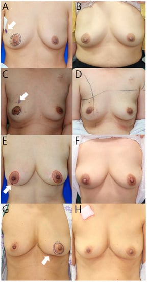 - Ogawa, T. Usefulness of breast-conserving surgery using the round block technique or modified round block technique in Japanese females. Asian J. Surg. 2014, 37, 8–14. [Google Scholar] [CrossRef][Green Version]