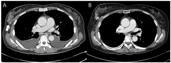 Chest CT image 3 weeks and 13 months after surgery. (A) A 54-year-old patient underwent breast reconstruction using the one ADM with the RBT after breast-conserving surgery. At 3 weeks after surgery, she complained of dyspnea during chemotherapy and a chest CT was taken. Seroma was noted on the chest CT (white arrow), and 5cc aspiration was performed, and was not observed when follow-up aspiration was performed 1 week later; (B) Seroma was no longer observed on the chest CT taken at 13 months after surgery.