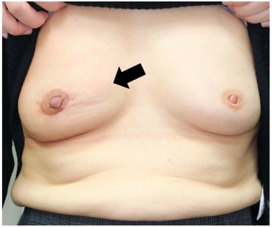 A 56-year-old patient’s 14-month postoperative photograph. The tumor was located in the upper inner quadrant of the right breast. And the resected breast tissue was 10 g, and 2 sheets of ADM were used. The black arrow indicates bulging deformity with severe hardness.